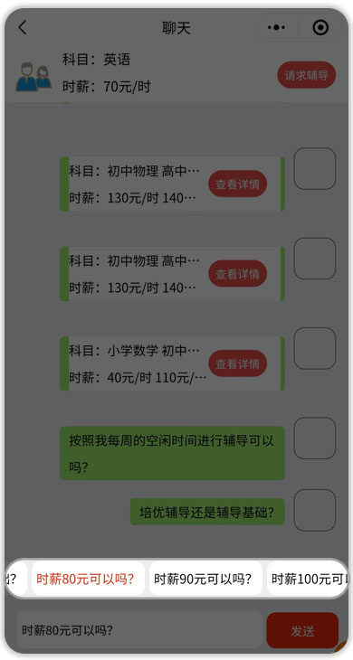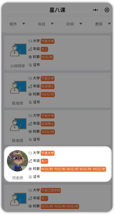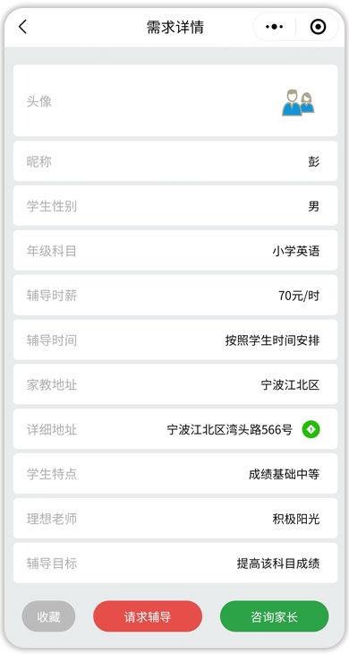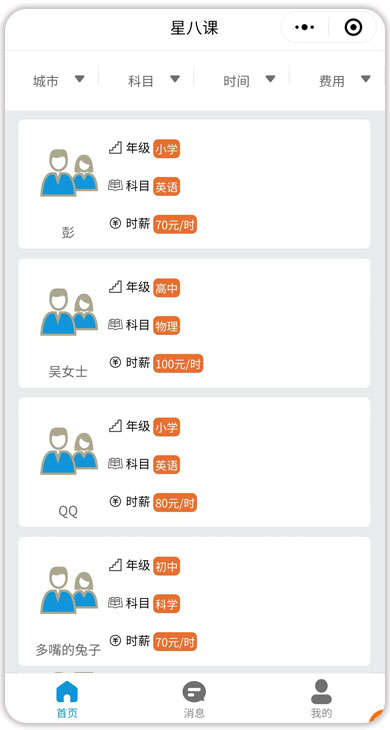 老师发的个人找家教信息,星八课的家长端用户会看到,直接联系老师